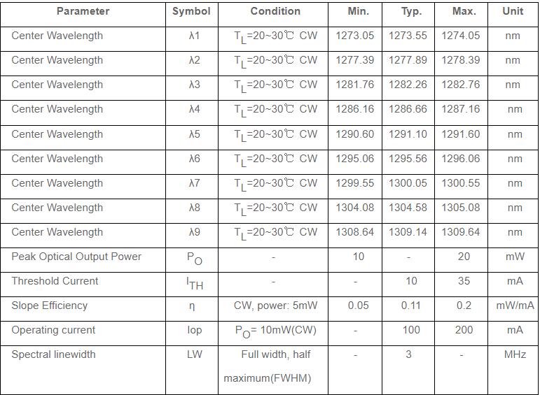 The 10mW 20mW LAN WDM DFB Laser Diodes consists of four wavelengths: 1273.55nm, 1277.89nm, 1282.26nm, 1286.66nm, 1291.10nm, 1295.56nm, 1300.05nm, 1304.58nm, 1309.14nm. Wavelength is temperature stabilized.