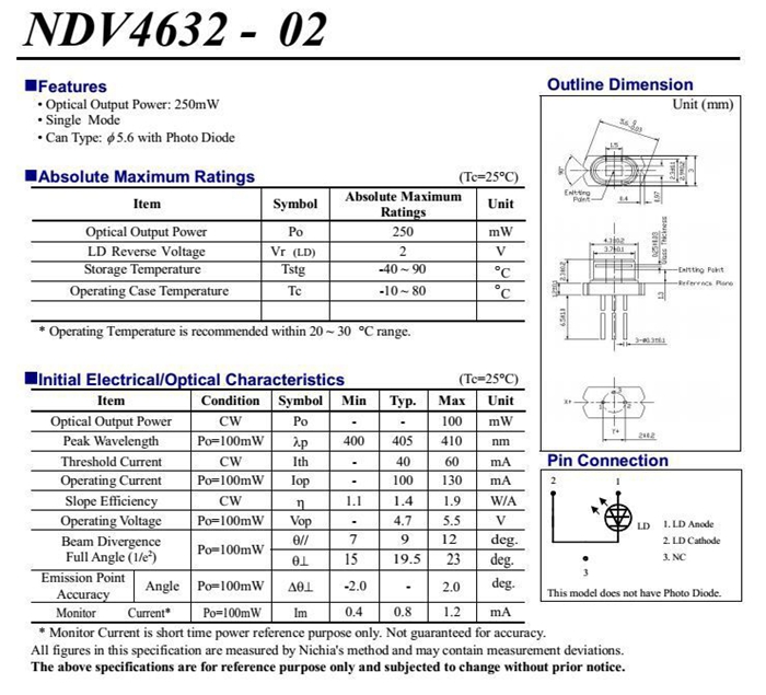 - :: Nichia Violet 405nm-450nm Laser Diode NDV4632