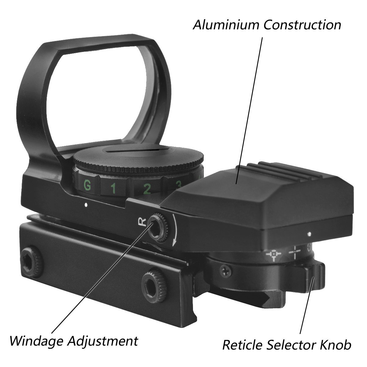 Tactical 4 Reticle Red Dot Open Reflex Sight with Weaver-Picatinny Rail Mount for 22 mm Rails.Rifle Scope, Red/Green/Blue multi-color illumination, range estimating mil-dot reticle, parallax adjustable, quick tactical zero-locking.setting target turrets for windage and elevation adjustment at 1/4 MOA per click.