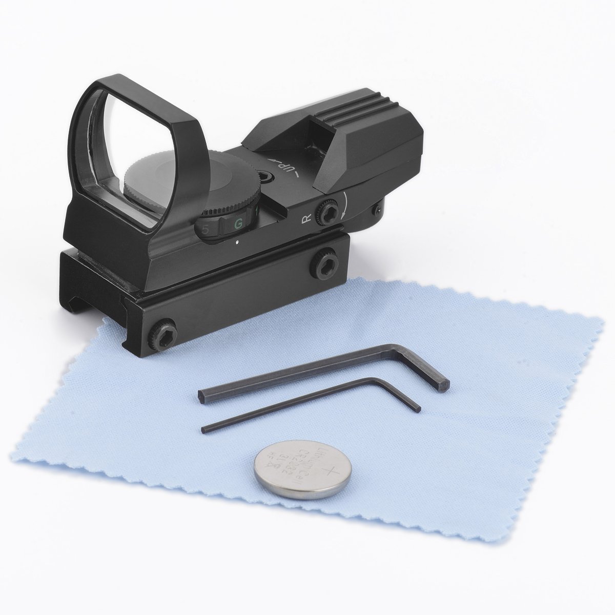 Package includes: 1X HD101A RED DOT SCOPE, 1X Cleaning Cloth, 1X CR2032 Battery ,1X Mounting tool ,1X Product Instruction